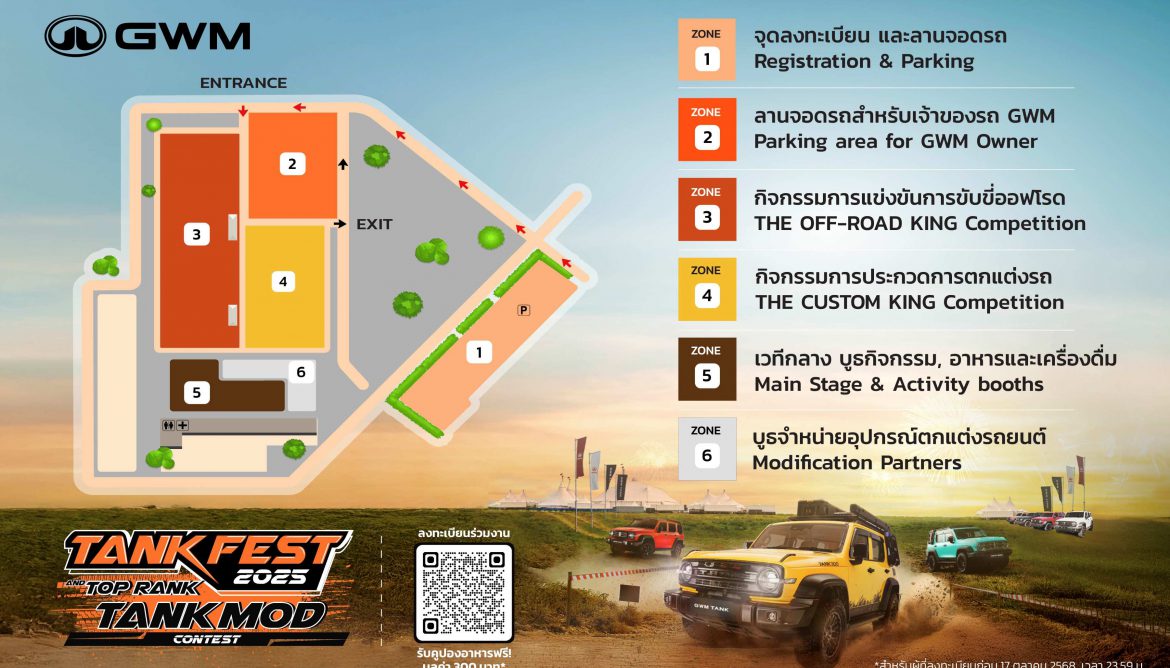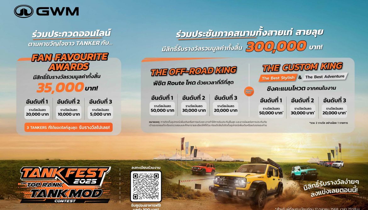 GWM (Thailand) ยกระดับสู่การเป็นแบรนด์รถยนต์ที่มีผลิตภัณฑ์ครอบคลุมทุกประเภทพลังงานที่ตอบสนองความต้องการของผู้ใช้งานทั่วทุกมุมโลก ด้วยแนวคิด “ครอบคลุมทุกการใช้งาน (All Scenarios) ด้วยผลิตภัณฑ์ที่ครอบคลุมทุกพลังงาน (All Powertrains) สู่การตอบสนองทุกกลุ่มผู้ใช้งานอย่างแท้จริง (All Users)” จากความสำเร็จของตระกูลรถออฟโรดทั้ง GWM TANK 300 และ GWM TANK 500 ที่ได้รับการตอบรับอย่างล้นหลามตั้งแต่เปิดตัว สู่จำนวน TANKER หรือผู้ใช้จริงที่เติบโตอย่างก้าวกระโดด เพื่อเป็นการขอบคุณลูกค้าชาวไทยทั่วประเทศและเนื่องในโอกาสเฉลิมฉลองการส่งมอบ NEW GWM TANK 300 DIESEL ครบ 5,000 คัน ปลุกกระแสคนรักรถ GWM TANK และการตกแต่ง รวมถึงเอาใจสายซิ่ง สายลุย และสายโหด GWM จึงจัดมหกรรมเฟสติวัลสุดยิ่งใหญ่ TANK FEST 2025 and TOP RANK TANK MOD” ครั้งแรกในไทย เนรมิตพื้นที่ขนาดมหึมาเกือบ 50,000 ตารางเมตร ให้เป็นลานกิจกรรมสุดเร้าใจ เปิดพื้นที่สำหรับแฟนพันธุ์แท้ GWM TANK ทั้งสายออฟโรดและสายชิลล์ผู้ที่ชื่นชอบการแต่งรถให้เป็นพื้นที่ได้ปล่อยของ ปลดปล่อยจินตนาการ และความคิดสร้างสรรค์ได้อย่างไร้ขีดจำกัด ผ่านกิจกรรมความสนุกที่อัดแน่นในทุกตารางนิ้ว ทั้งเวทีประกวดและจัดแสดงรถแต่ง การแข่งขันการขับขี่ออฟโรดสุดครีเอทีฟ สนามเทสต์สมรรถนะ GWM TANK กิจกรรมความสนุกอีกมากมาย พร้อมรับของที่ระลึกติดไม้ติดมือกลับบ้าน การันตีความอร่อยตลอดวันด้วยสตรีทฟู้ดกับ Food truck เจ้าดังจำนวนมาก รับชมการแสดงดนตรีคลอเคล้าบรรยากาศจากวงดนตรีชื่อดังตั้งแต่เช้าจรดเย็น พร้อมตบท้ายด้วยคอนเสิร์ตจากศิลปินชื่อดังยามค่ำคืน สำหรับผู้ที่สนใจทุกคนเข้าร่วมงานฟรีแบบไม่มีค่าใช้จ่าย จะมาคนเดียว มาเป็นคู่ เป็นแก๊งค์ หรือยกขบวนทั้งครอบครัว ปักหมุดแล้วมาเจอกัน วันเสาร์ที่ 18 ตุลาคม 2568 ณ ESC Park รังสิต จ.ปทุมธานี และวันอาทิตย์ที่ 19 ตุลาคม 2568 สำหรับผู้ที่สนใจทดลองขับ GWM