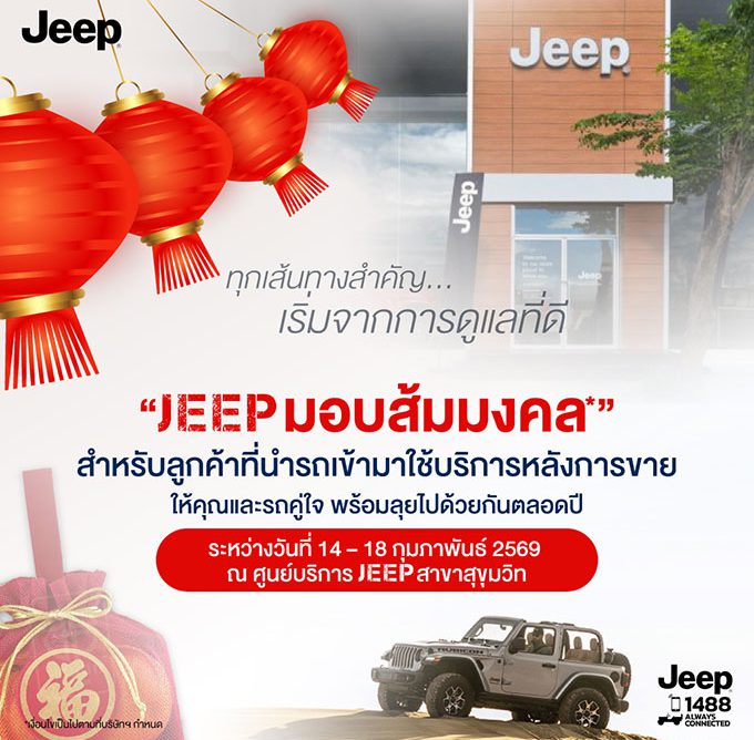 อย่างเป็นทางการในประเทศไทย ร่วมฉลองเดือนแห่งความรักและเทศกาลตรุษจีน จัดงาน ‘Golden Harmony: Love, Prosperity & Future Mobility’ ชวนแฟนพันธุ์แท้รถยนต์สายลุย สัมผัส จี๊ป รุ่นฮอต นำโดย แรงเลอร์ รูบิคอน และ กลาดิเอเตอร์ รูบิคอน พร้อมรับของขวัญมงคลเสริมเฮงปีม้า ระหว่างวันที่ 14-18 กุมภาพันธ์ 2569 ที่โชว์รูมพร้อมศูนย์บริการครบวงจร จี๊ป ไลอ้อน ออโต้โมบิล สุขุมวิท