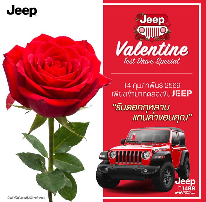 และวาเลนไทน์ พร้อมเชิญชวนสัมผัส จี๊ป รุ่นไฮไลท์ อย่าง แรงเลอร์ รูบิคอน และ กลาดิเอเตอร์ รูบิคอน ที่มาพร้อมการขยายระยะเวลาการรับประกันคุณภาพสูงสุดถึง 7 ปี อีกทั้งอุปกรณ์ตกแต่งแท้มูลค่าสูงสุด 1 ล้านบาท พิเศษเมื่อทดลองขับและจองรถภายในงาน รับข้อเสนอสุดคุ้ม พร้อมอั่งเปาและส้มมงคลรับตรุษจีน เพื่อความเป็นสิริมงคลในการเริ่มต้นปีใหม่”