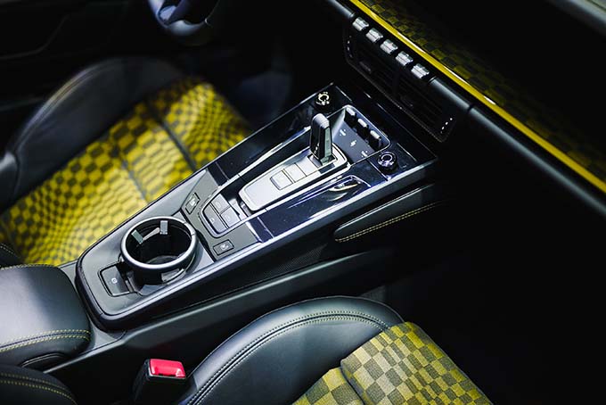 การตกแต่งภายในโดดเด่นด้วยลาย Pasha สีดำตัดกับสีเขียว ลายที่ได้รับแรงบันดาลใจจากธงตราหมากรุกที่กำลังโบกสะบัด ด้วยการจัดวางสี่เหลี่ยมหลายขนาดเพื่อสร้างมิติของการเคลื่อนไหว เพื่อให้ความรู้สึกถึงรถแข่งในยุค 70 และหนัง Club Leather สี Basalt Black พร้อมเดินตะเข็บด้ายสี Olive Neo รวมถึง