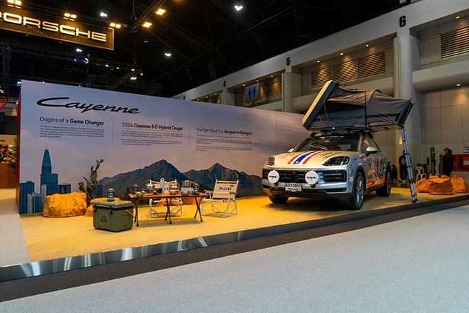 พร้อมการจัดแสดงรถยนต์ไฮไลท์อย่าง คาเยนน์ เอส อี ไฮบริด คูเป้ (Cayenne S E-Hybrid Coupé) รุ่นประกอบที่มาเลเซีย ที่เข้าร่วมภารกิจ Epic Road Trip การเดินทางจากกรุงเทพฯ สู่สตุ๊ทการ์ท ในเวลา 61 วัน ผ่าน 17 ประเทศ รวมระยะทางกว่า 22,000 กิโลเมตร และคาเยนน์ เอส อี ไฮบริด คูเป้  รุ่นปรับโฉมปี 2026 ที่ประกอบในประเทศมาเลเซีย ที่แสดงให้เห็นถึงความทนทานและมาตรฐานทางวิศวกรรมที่แข็งแกร่งของคาเยนน์ รุ่นประกอบในภูมิภาค