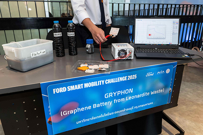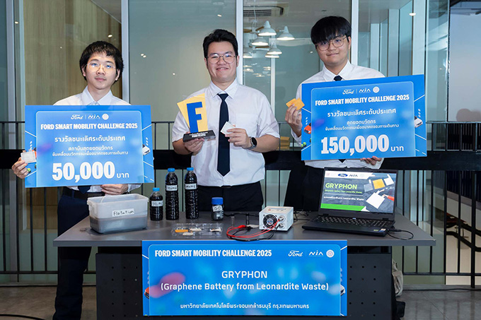 ฟอร์ด ประเทศไทย ร่วมกับสมาคมพัฒนาประชากรและชุมชน (PDA) สำนักงานนวัตกรรมแห่งชาติ (NIA) และบริษัท ทีวีบูรพา จำกัด จัดงานประกวดนวัตกรรมสิ่งประดิษฐ์ ‘Ford Smart Mobility Challenge 2025’ รอบตัดสิน ท่ามกลางบรรยากาศการนำเสนอผลงานอย่างเข้มข้น รวมถึงการรับฟังคำแนะนำและแนวทางการพัฒนาจากกรรมการผู้เชี่ยวชาญ โดยในปีนี้ ผลงาน ‘Graphene Battery from Leonardite Waste’ จากมหาวิทยาลัยเทคโนโลยีพระจอมเกล้าธนบุรี กรุงเทพมหานคร สามารถคว้ารางวัลชนะเลิศไปครอง ด้วยการนำของเสียจากเหมืองถ่านหินในประเทศไทยมาสร้างมูลค่า สนับสนุนความปลอดภัยในการใช้งานแบตเตอรี่ ทำให้เกิดการใช้พลังงานหมุนเวียน ซึ่งเป็นการจัดการสิ่งแวดล้อมที่ยั่งยืน อีกทั้งยังมีแนวทางการต่อยอดผลงานที่ชัดเจน รวมถึงความคิดสร้างสรรค์และการนำเสนอผลงานที่โดดเด่น เมื่อวันที่ 28 ตุลาคม ณ อาคาร KX Knowledge Xchange