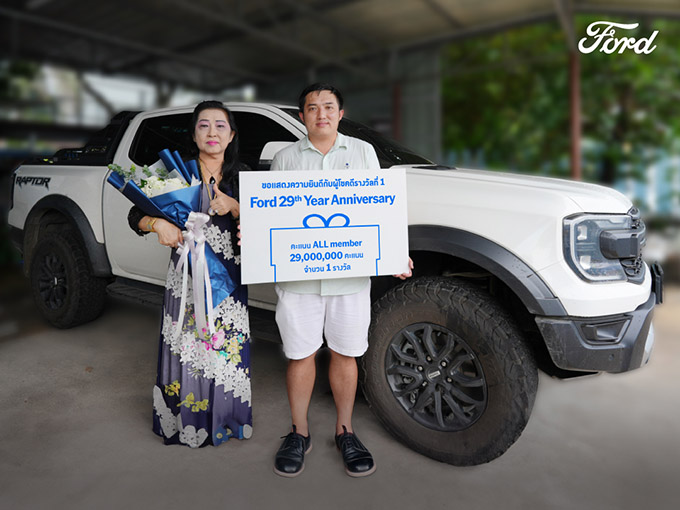 – ฟอร์ด ประเทศไทย มอบรางวัลแก่ผู้โชคดีที่ได้รับรางวัลที่ 1 จากแคมเปญฉลองครบรอบ 29 ปี รับคะแนน ALL Member 29 ล้านคะแนน ได้แก่ คุณสุขใจ สุดดี ลูกค้าที่ซื้อรถฟอร์ด เรนเจอร์ แร็พเตอร์ เครื่องยนต์ 2.0 ลิตร
