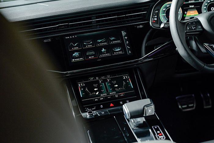 ระบบ MMI Navigation plus พร้อม MMI touch ขนาด 10.1 นิ้ว และจอควบคุม multi-function แบบสัมผัส พร้อมตอบสนองการสั่งงาน (haptic feedback) ขนาด 8.6 นิ้ว พร้อม Paddle shift จอแสดงข้อมูลการขับขี่แบบ Virtual cockpit ขนาด 12.3 นิ้ว ระบบเครื่องเสียงระดับพรีเมียม Bang & Olufsen พร้อมระบบเสียง 3 มิติ 17 ตำแหน่ง 730 วัตต์ ระบบปรับอากาศอัตโนมัติแบบ 3 โซน และเพิ่มฟังก์ชั่นเปิดแอร์ได้ขณะดับเครื่อง (Stationary Air-conditioning) ช่วงล่างระบบถุงลม (Adaptive air suspension) ในรุ่น Audi Q7 60 TFSI e quattro S line Black Edition และ ช่วงล่างระบบถุงลมแบบ Sport ในรุ่น Audi Q8 60 TFSI e quattro S line Black Edition ภายในพื้นที่ห้องโดยสารและพื้นที่เก็บสัมภาระนั้นกว้างขวาง ถือได้ว่าเป็น SUV ที่ขนาดใหญ่ที่สุดในเซกเมนต์ รองรับการเดินทางของครอบครัวใหญ่หรือเพื่อนร่วมทริปได้อย่างสบายๆ นอกจากนี้ Audi Q8 60 TFSI e quattro S line Black Edition ยังมาพร้อมอุปกรณ์มาตรฐาน อาทิเช่น กล้องรอบคัน 360 องศา ประตูไฟฟ้าอัตโนมัติ หลังคาพาโนรามิค และแร็คบรรทุกสัมภาระบนหลังคา