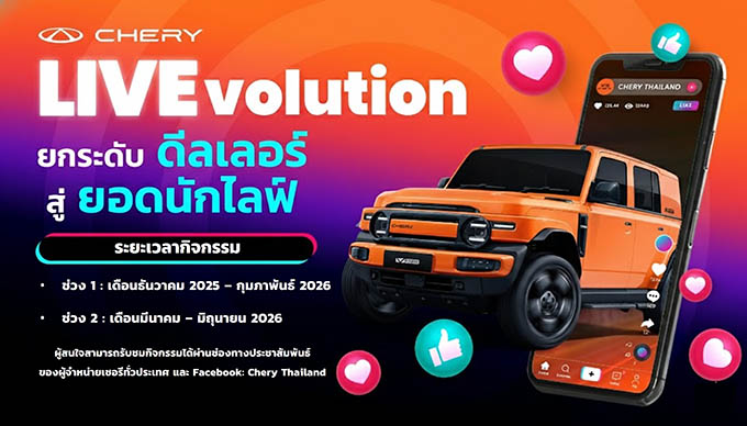 Chery LIVEvolution นับเป็นอีกก้าวสำคัญในการยกระดับและพัฒนาศักยภาพเครือข่ายผู้จำหน่ายให้พร้อมรับการเปลี่ยนแปลงของตลาดยุคดิจิทัล และยกระดับประสบการณ์การสื่อสารกับลูกค้าให้ทันสมัยมากยิ่งขึ้น กิจกรรมแบ่งการจัดออกเป็น 2 ช่วง ได้แก่ เดือนธันวาคม 2025 – กุมภาพันธ์ 2026 และเดือนมีนาคม – มิถุนายน 2026 ผู้สนใจสามารถรับชมกิจกรรมได้ผ่านช่องทางประชาสัมพันธ์ของผู้จำหน่ายเชอรีทั่วประเทศ และ Facebook: Chery Thailand