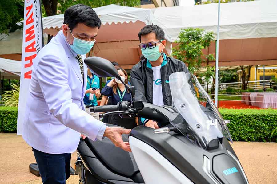 นายพงศธร เอื้อมงคลชัย รองประธานกรรมการบริหาร นางสาวบัวทิพย์ จันทร์ดำรงกุล รองผู้จัดการใหญ่ด้านวางแผนการค้า นายสมเกียรติ พูลขวัญ รองผู้จัดการใหญ่ด้านบริหาร บริษัท ไทยยามาฮ่ามอเตอร์ จำกัด ถ่ายภาพร่วมกับ ศ.นพ.กีรติ เจริญชลวานิช รองคณบดีฝ่ายสร้างเสริมสุขภาพ โรงพยาบาลศิริราช ในการส่งมอบรถจักรยานยนต์ไฟฟ้า “YAMAHA E01” สำหรับใช้งานในพื้นที่ของโรงพยาบาล เพื่อลดการเกิดมลภาวะและความคล่องตัวในการใช้งานในพื้นที่โรงพยาบาล พร้อมกันนี้ไทยยามาฮ่ายังจะได้ทำการเก็บข้อมูลการใช้งานต่างๆ ของรถจักรยานยนต์ไฟฟ้า “YAMAHA E01” ผ่านระบบ eSIM เพื่อนำไปต่อยอดและพัฒนารถจักรยานยนต์ไฟฟ้าก่อนการผลิตเพื่อจำหน่ายจริง โดยมีความร่วมมือกับภาครัฐ สถาบันการศึกษา หน่วยงานที่เกี่ยวข้อง เพื่อศึกษาการใช้งานจริง ในโครงการทดสอบวิเคราะห์ความเป็นไปได้ (Proof of Concept : POC)
