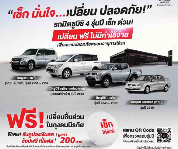 ห่วงใยลูกค้าตลอดอายุการใช้งาน ชวนเจ้าของรถยนต์มิตซูบิชิ 4 รุ่นปี ทั้งมือหนึ่ง มือสองเปลี่ยนชิ้นส่วนในถุงลมนิรภัย ฟรี! พร้อมรับคูปองเงินสด ถึง 15 พฤศจิกายน 2566 บริษัท มิตซูบิชิ มอเตอร์ส (ประเทศไทย) จำกัด เปิดตัวแคมเปญ “เช็ก มั่นใจ…เปลี่ยน ปลอดภัย!” เชิญชวนเจ้าของรถยนต์มิตซูบิชิ 4 รุ่นปี ทั้งมือหนึ่งและมือสอง ให้นำรถเข้าศูนย์บริการของมิตซูบิชิ มอเตอร์ส เพื่อรับบริการตรวจสอบหรือเปลี่ยนชิ้นส่วนในถุงลมนิรภัย โดยไม่มีค่าใช้จ่ายใดๆ เสริมความปลอดภัยตลอดอายุการใช้รถ พร้อมรับฟรี! “คูปองเงินสดมูลค่า 200 บาท” ของขวัญสมนาคุณพิเศษจาก มิตซูบิชิ มอเตอร์ส ประเทศไทย เมื่อนำรถยนต์ 4 รุ่นปีดังกล่าวมาเข้ารับบริการในระหว่างวันที่ 16 สิงหาคม – 15 พฤศจิกายน 2566 นี้ รถยนต์มิตซูบิชิ 4 … More…