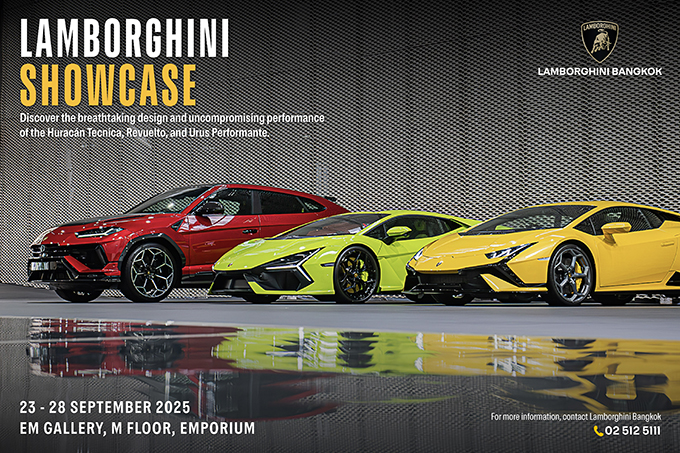 บริษัท เรนาสโซ มอเตอร์ จำกัด ตัวแทนจำหน่ายรถยนต์ลัมโบร์กินีอย่างเป็นทางการรายเดียวในประเทศไทย นำโดย อภิชาติ ลีนุตพงษ์ ประธานกรรมการ, ศักดิ์ นานา และ ม.ล.พลอยนภัส ลีนุตพงษ์ กรรมการ ยกทัพจัดแสดงที่สุดแห่งขุมพลังไฮบริด Lamborghini Revuelto และ The Last NA รุ่นไอคอนิกระดับตำนาน อย่าง Huracan Tecnica และ Urus Performante ในงาน LAMBORGHINI SHOWCASE 2025 ภายในงานเหล่าสาวกกระทิงดุเตรียมสัมผัสตัวจริงกันอย่างใกล้ชิด นอกจากนี้ยังมีสินค้าคอลเลกชันลัมโบร์กินีให้เหล่าแฟนพันธุ์แท้ได้เลือกช้อปกัน ระหว่างวันที่ 23-28 กันยายน 2568 ณ ดิเอ็มโพเรียม, EM Gallery ชั้น M