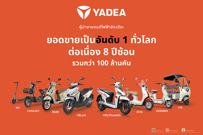YADEA (ออกเสียงว่า ยา-เดีย) เป็น แบรนด์มอเตอร์ไซค์ไฟฟ้าที่มียอดขายสูงสุดในโลกติดต่อกัน 8 ปีซ้อน (ตั้งแต่ปี 2017– ปี 2024) มียอดขายสะสมกว่า 120 ล้านคัน และมีโรงงานกว่า 10 แห่งทั่วโลก ทั้งในประเทศจีน ไทย อินโดนีเซีย เวียดนาม เม็กซิโก และบราซิล โดยมีสายการผลิตอัจฉริยะรวมกว่า 100 สาย ผลิตได้สูงสุด 30 ล้านคันต่อปี ด้วยระบบอัตโนมัติประสิทธิภาพสูงและความเร็วในการผลิตที่เหนือชั้นจึงสามารถผลิตรถได้ 1 คันในทุกๆ 25 วินาที และคุณภาพผ่านเกณฑ์การผลิตกว่า 99.9% สะท้อนมาตรฐานการผลิตระดับโลก